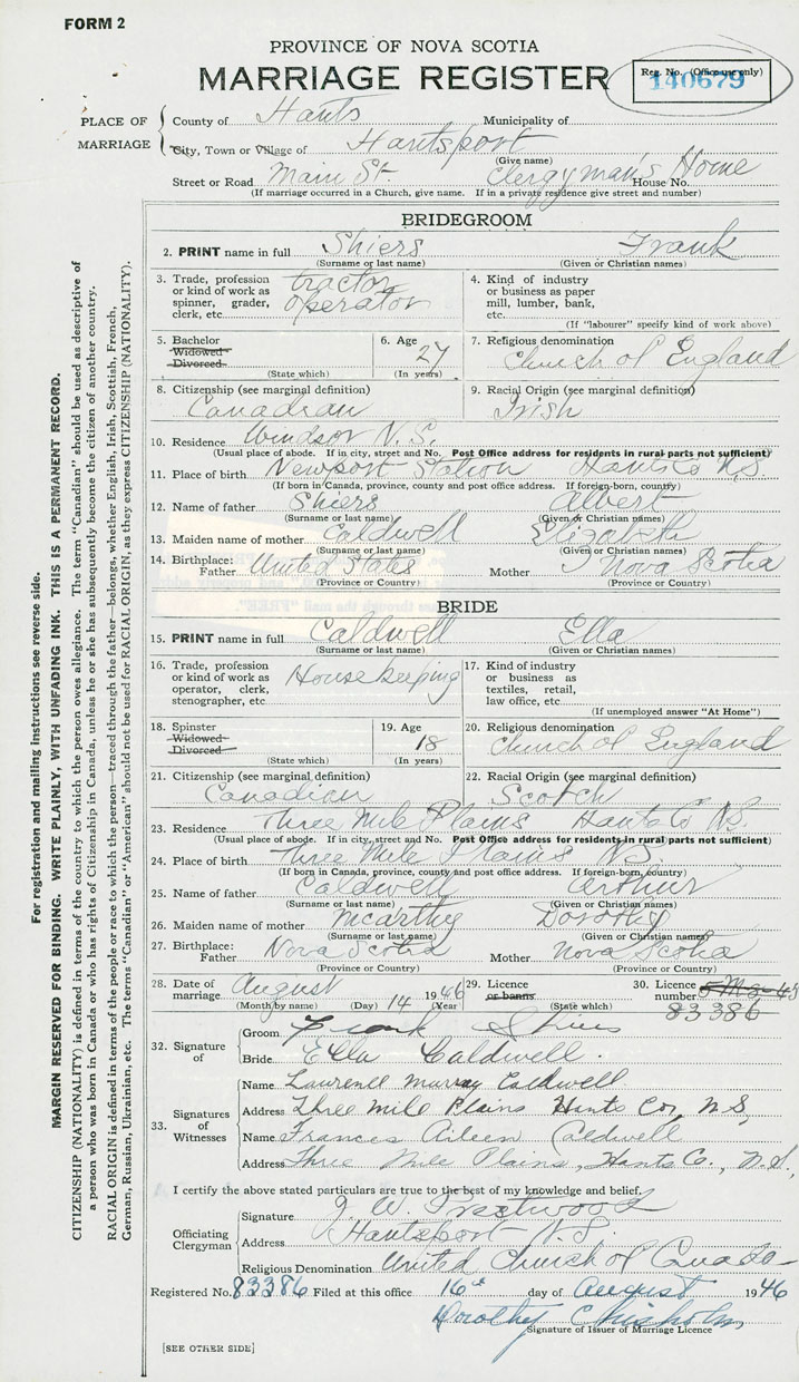 28. Date of marriage August 14 1946 29. By license or banns License 30. License number 83386