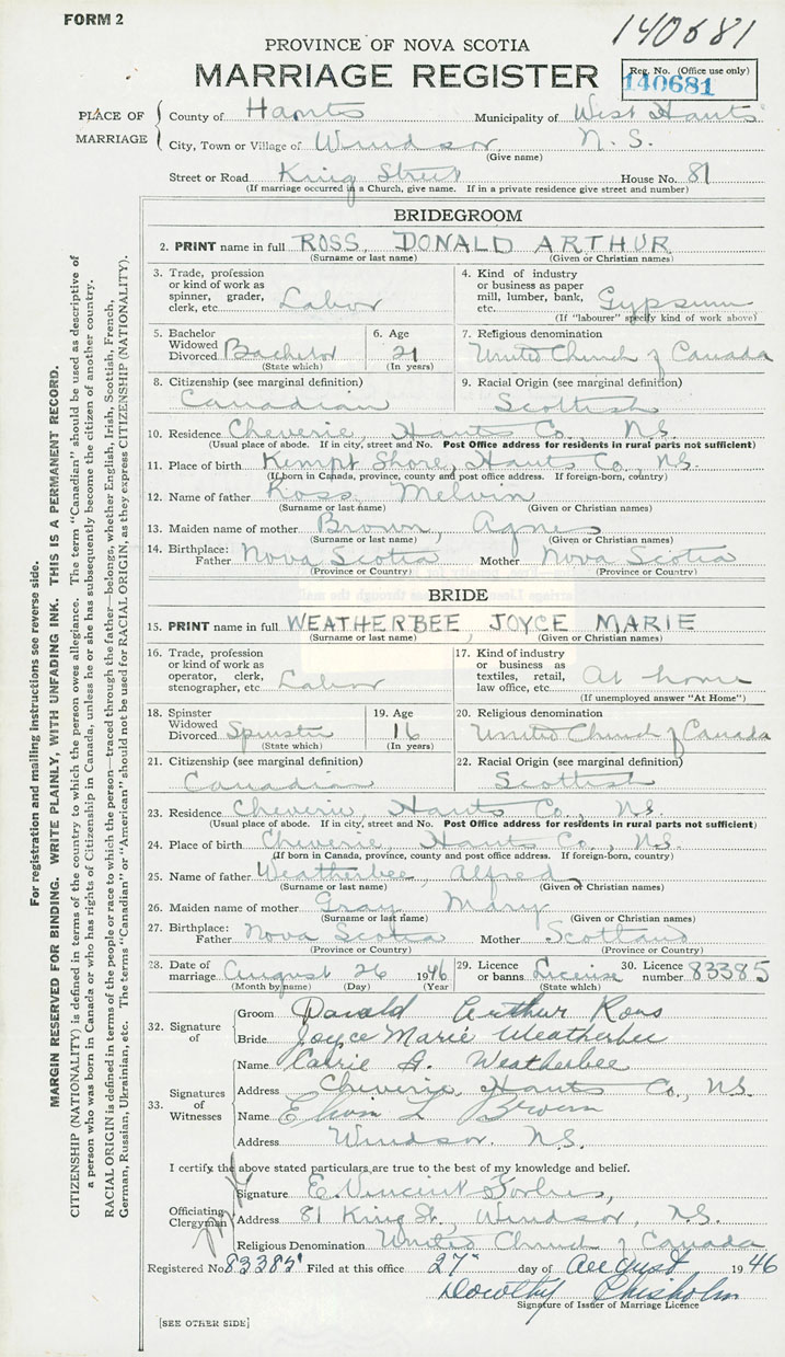 28. Date of marriage August 26 1946 29. By license or banns License 30. License number 83385