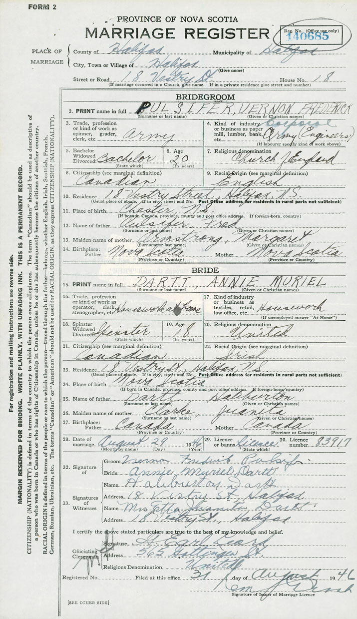 28. Date of marriage August 29 1946 29. By license or banns License 30. License number 83917