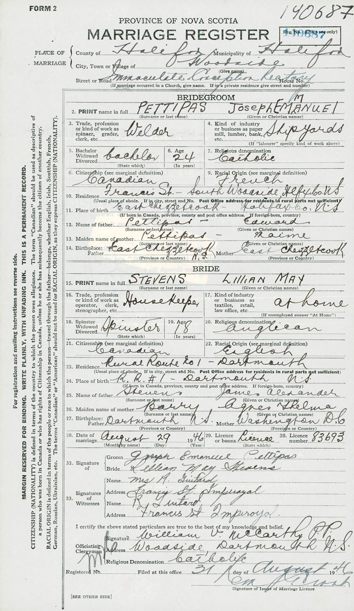 28. Date of marriage August 29 1946 29. By license or banns License 30. License number 83693