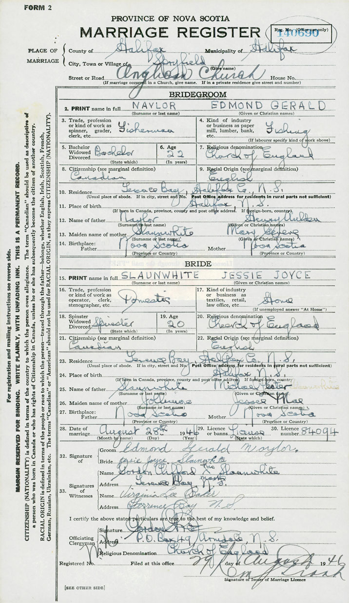 28. Date of marriage August 28 1946 29. By license or banns License 30. License number 84094