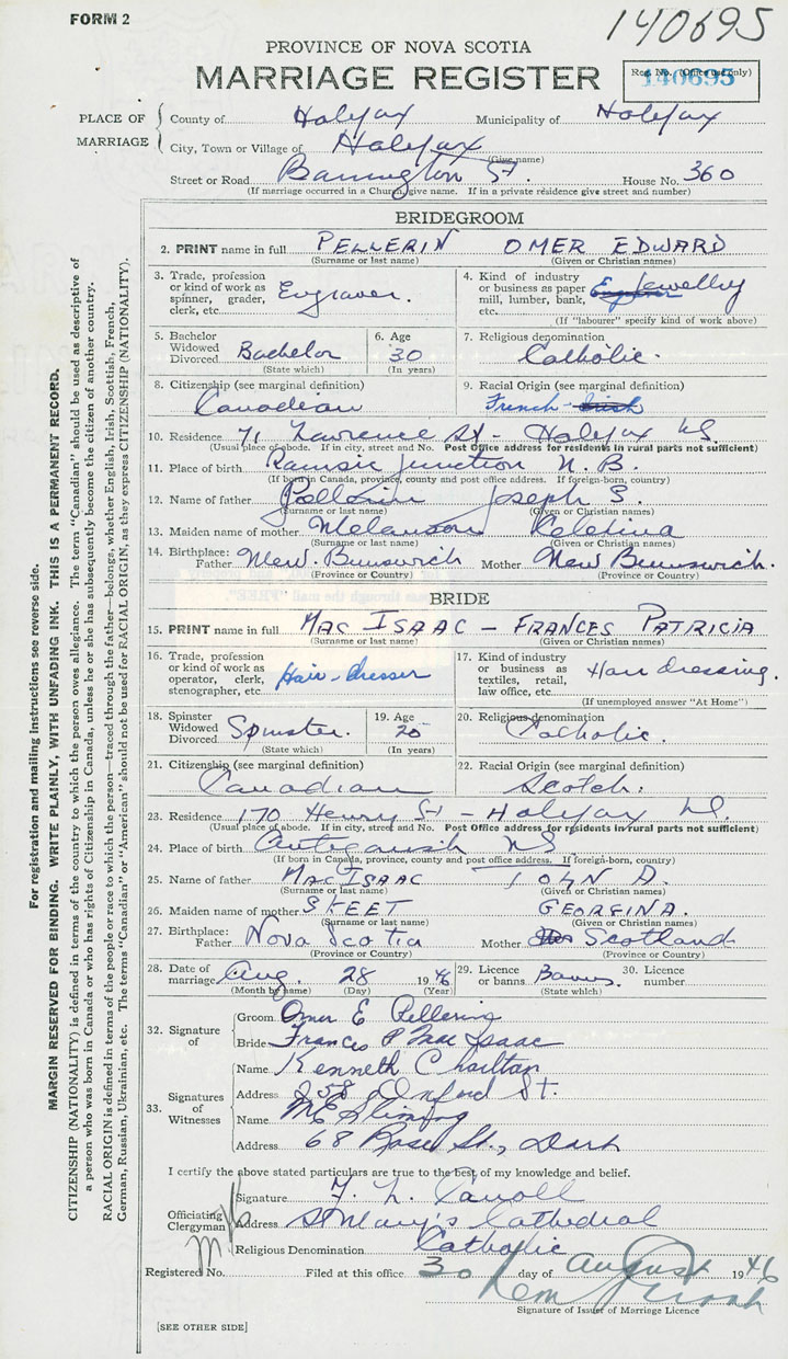 28. Date of marriage August 28 1946 29. By license or banns License 30. License number