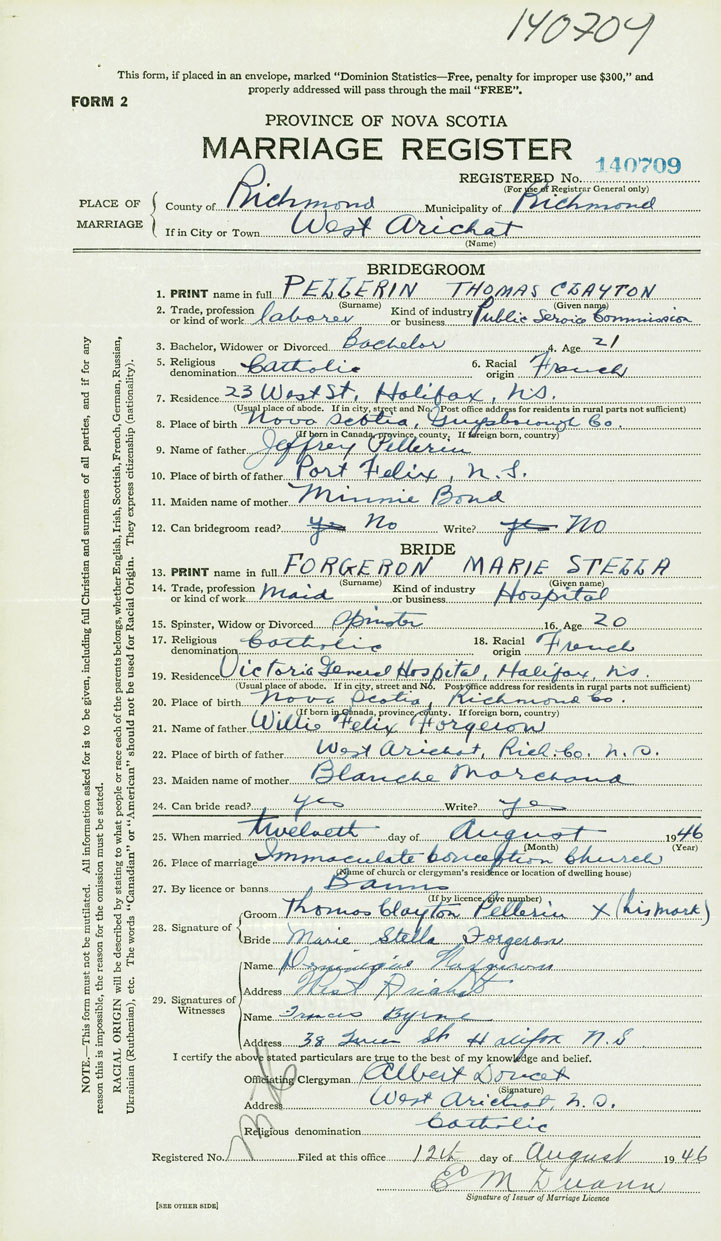 26. Place of marriage Immaculate Conception Church West Arichat, Richmond County