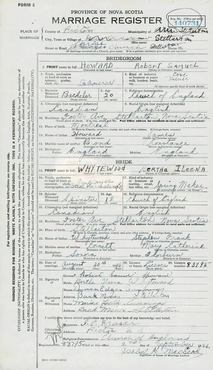 28. Date of marriage August 30 1946 29. By license or banns License 30. License number 83795