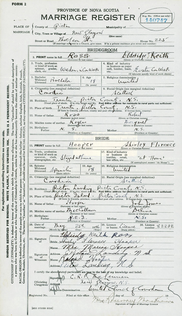 28. Date of marriage May 25 1946 29. By license or banns License 30. License number 82232
