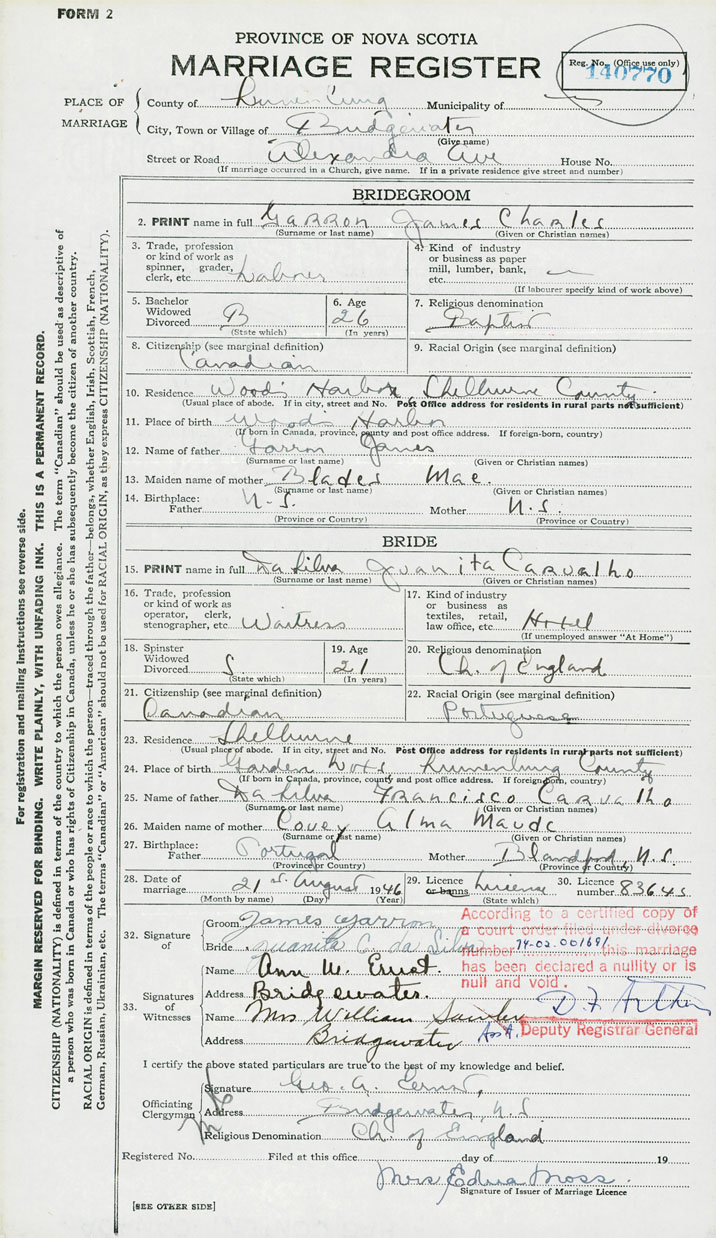 According to a certified copy of the Decree Absolute for Divorce dated 1974-- and filed in the Office of the Registrar General under Divorce number 74-02-001691, it is ordered that the marriage of James Charles Garron and Juanita Carvalho Dasilva (Registered under marriage number 1946-140770) be null and void.