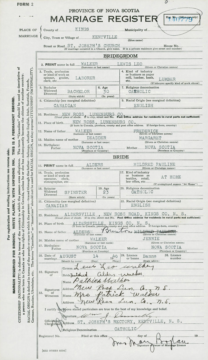 28. Date of marriage August 14 1946 29. By license or banns License 30. License number