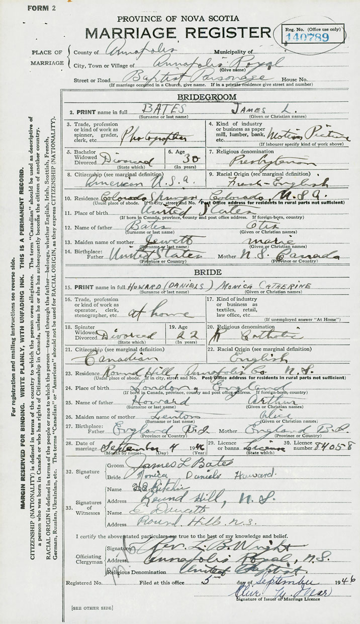 28. Date of marriage September 4 1946 29. By license or banns License 30. License number 84058