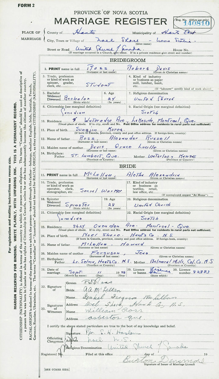 28. Date of marriage September 11 1946 29. By license or banns License 30. License number 82883