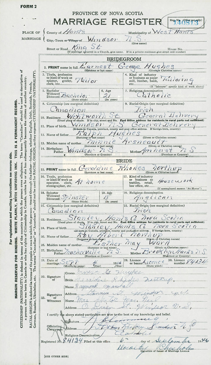 28. Date of marriage September 4 1946 29. By license or banns License 30. License number 84134