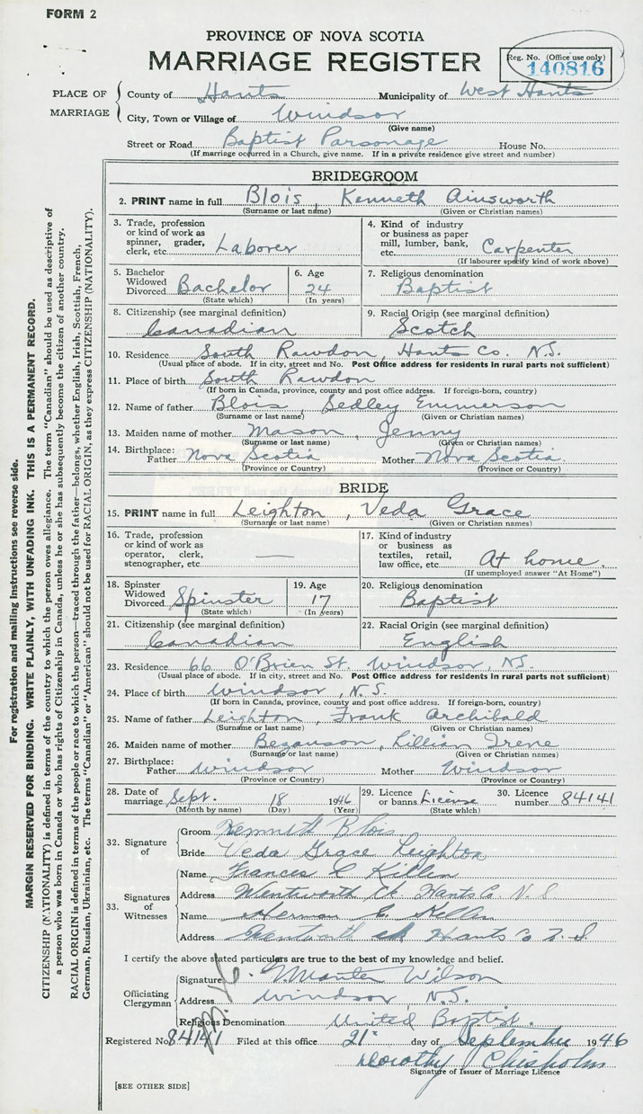 28. Date of marriage September 18 1946 29. By license or banns License 30. License number 84141