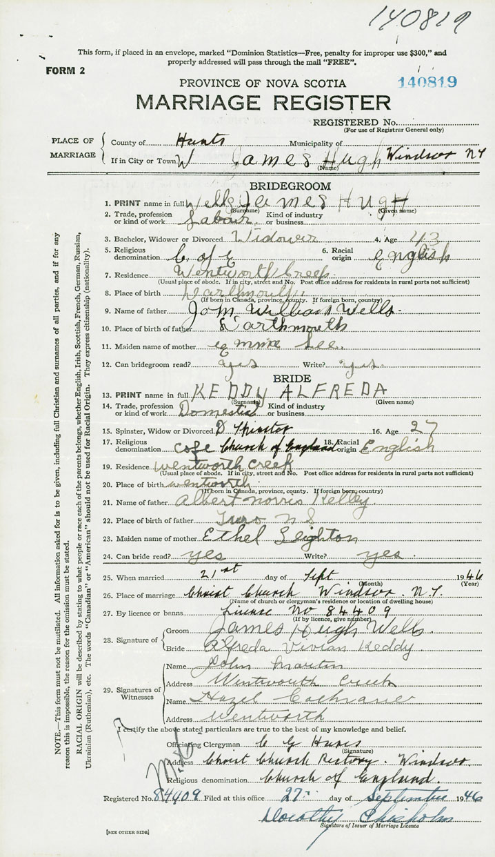 PLACE OF MARRIAGE County of Hants in City or Town Windsor