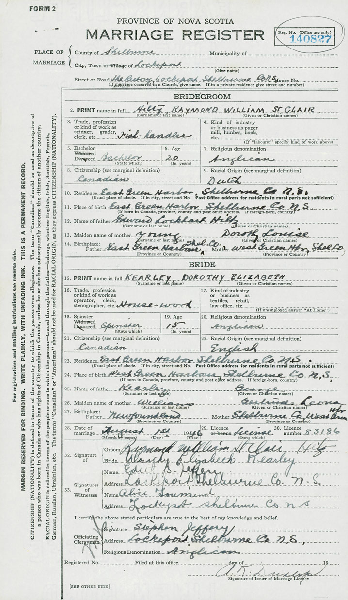 28. Date of marriage August 1 1946 29. By license or banns License 30. License number 83186