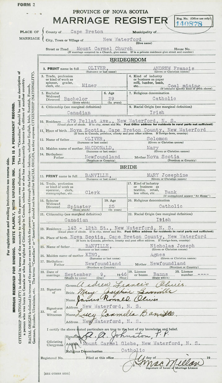 24. Place of birth New Waterford, Cape Breton County