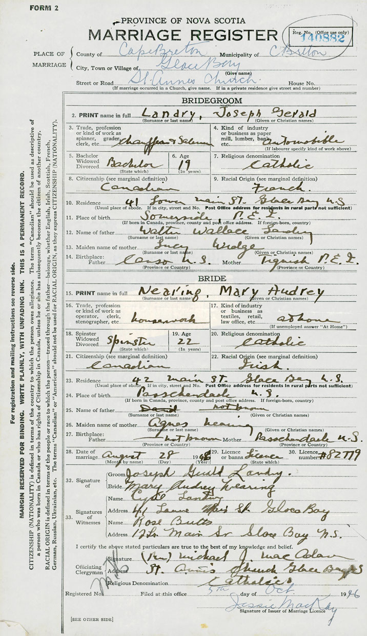 28. Date of marriage August 28 1946 29. By license or banns License 30. License number 82779