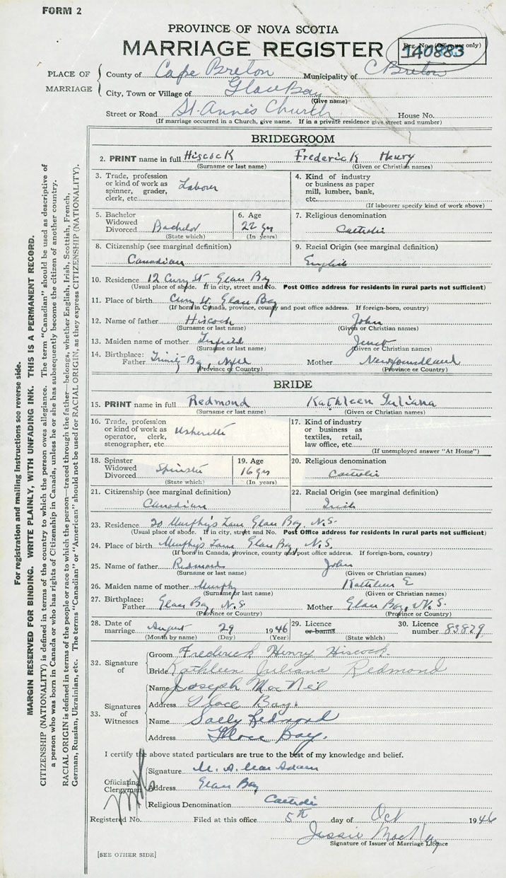 28. Date of marriage August 29 1946 29. By license or banns License 30. License number 83879