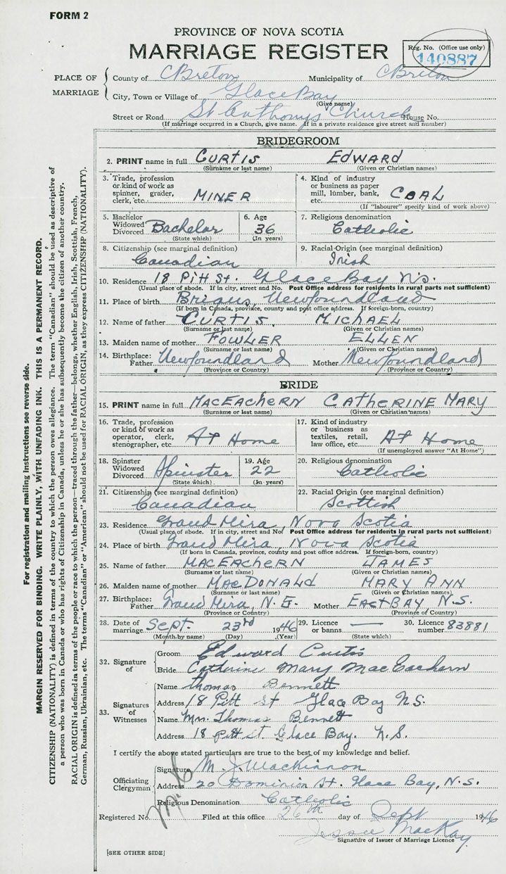 PLACE OF MARRIAGE County of Cape Breton