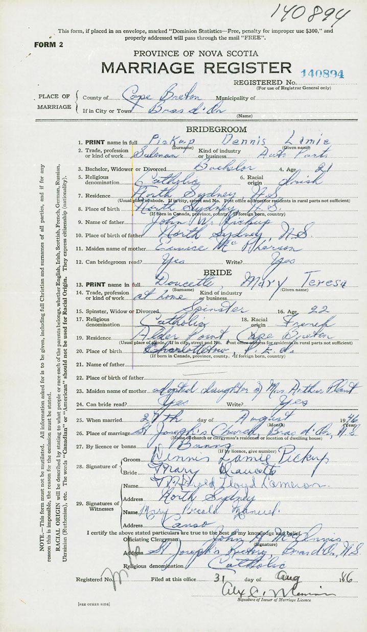 26. Place of marriage St. Joseph's Church Bras d'Or, Cape Breton County