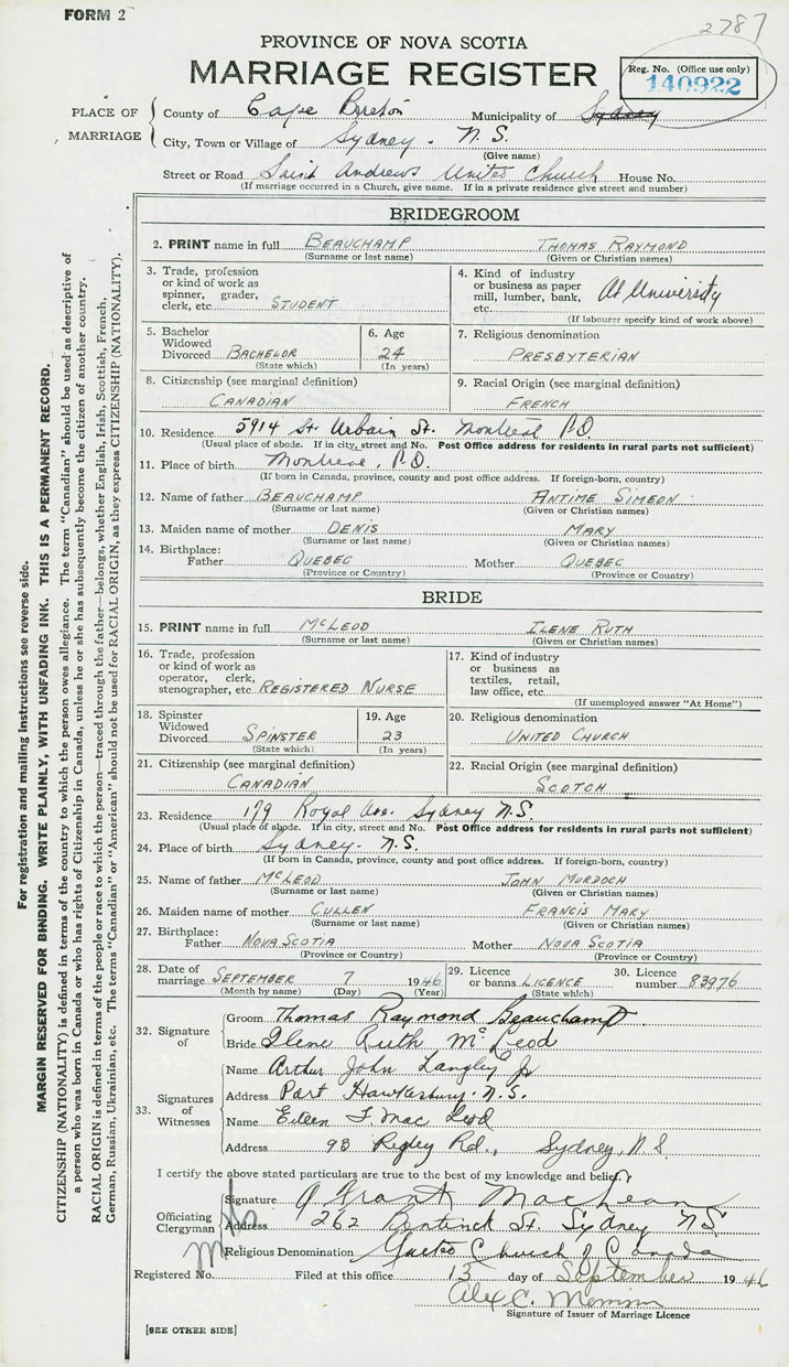 28. Date of marriage September 7 1946 29. By license or banns License 30. License number 83976