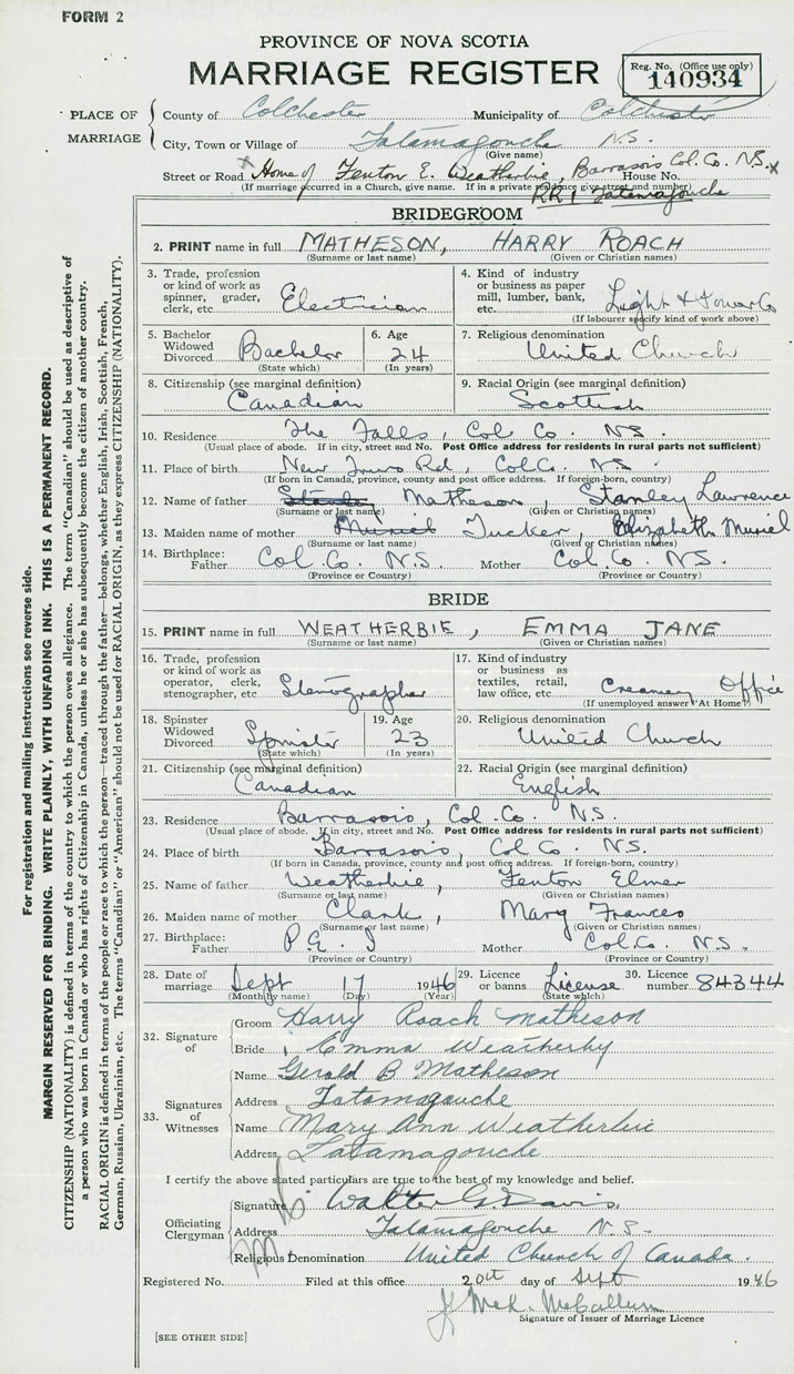 28. Date of marriage September 17 1946 29. By license or banns License 30. License number 84344