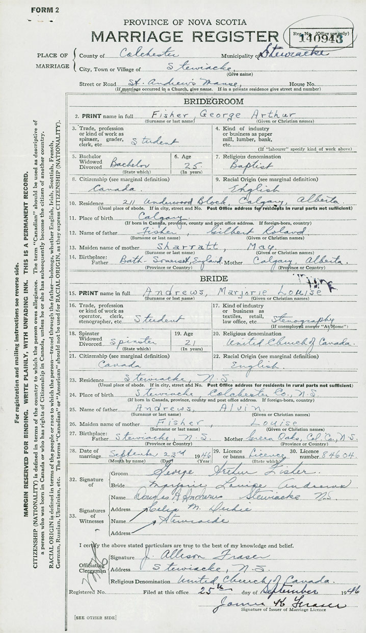 28. Date of marriage September 23 1946 29. By license or banns License 30. License number 84604