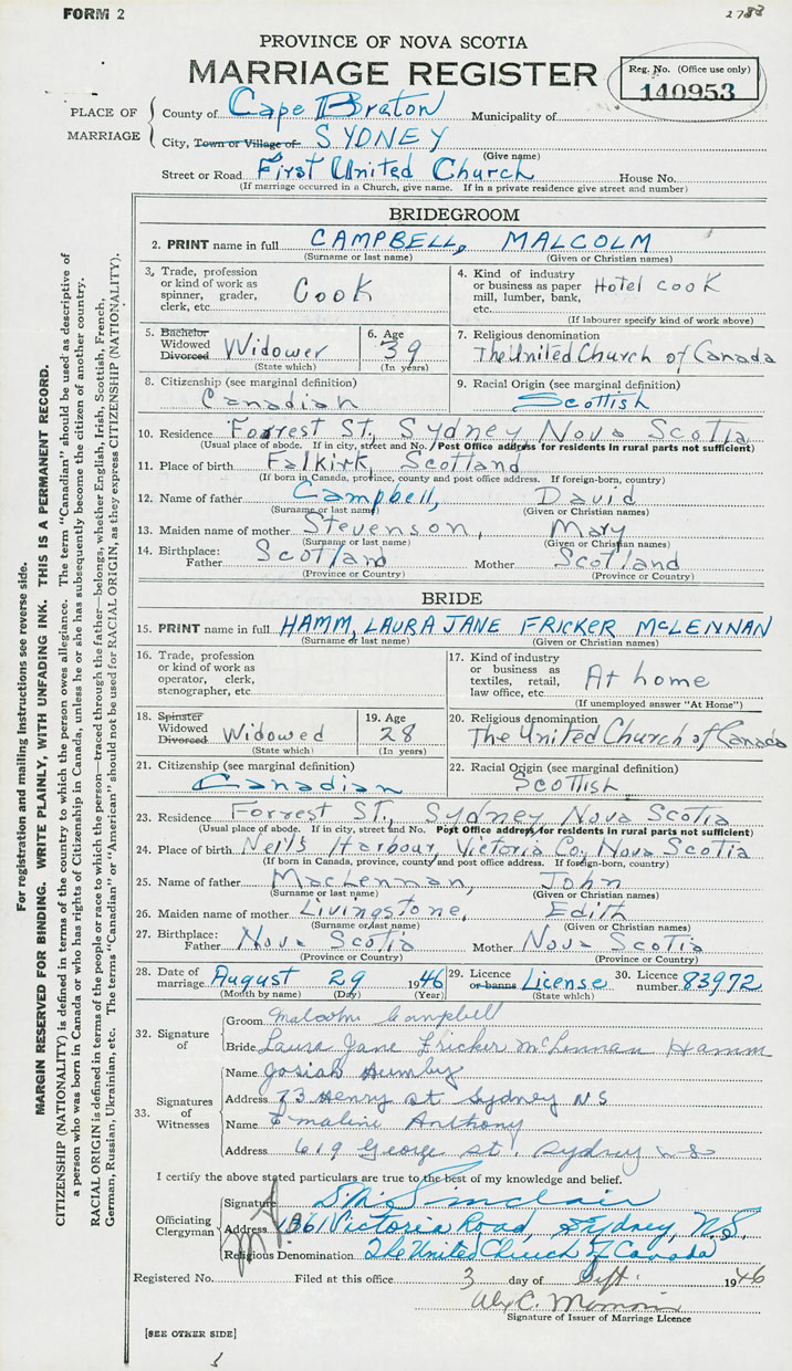 28. Date of marriage August 29 1946 29. By license or banns License 30. License number 83972