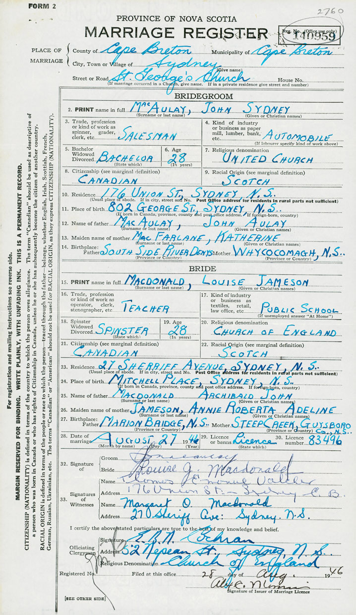 28. Date of marriage August 27 1946 29. By license or banns License 30. License number 83496