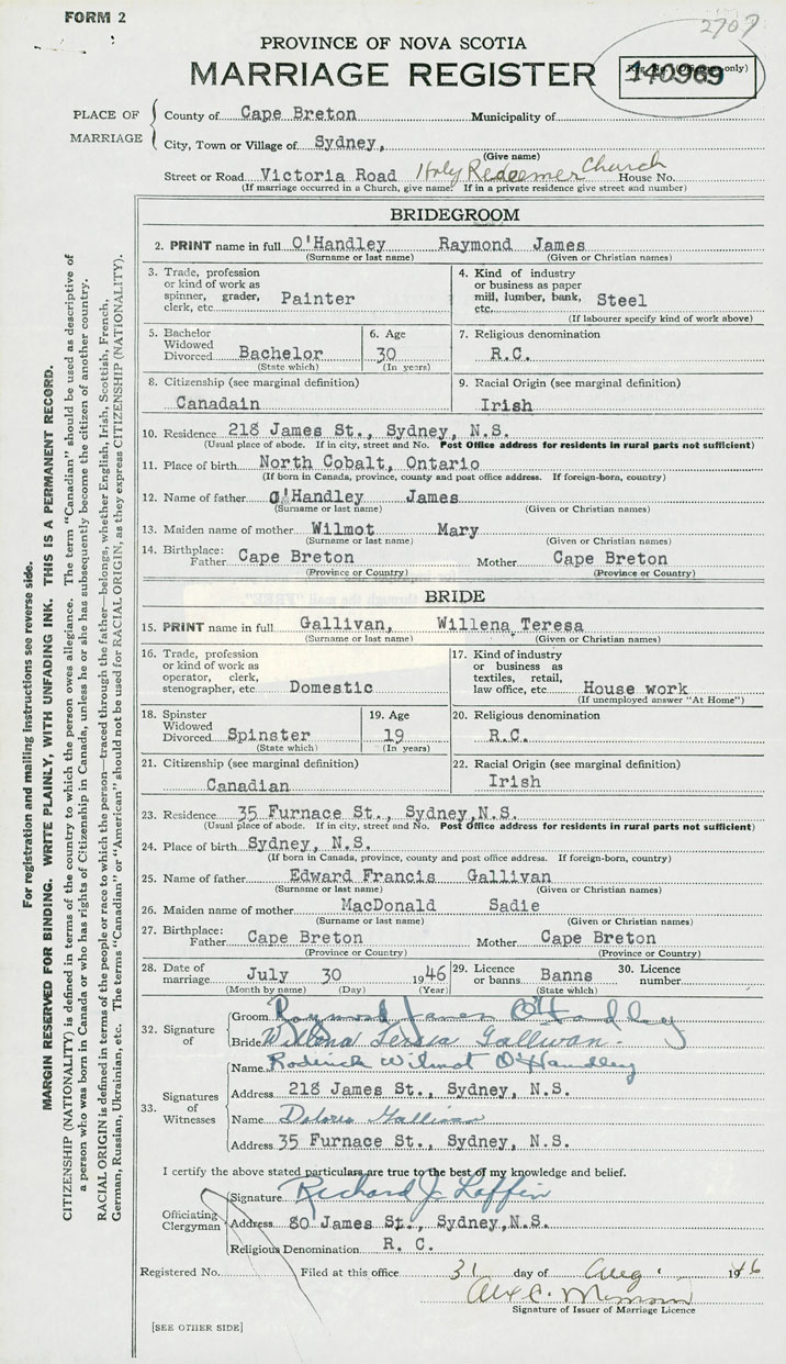12. Name of father James O'Handley