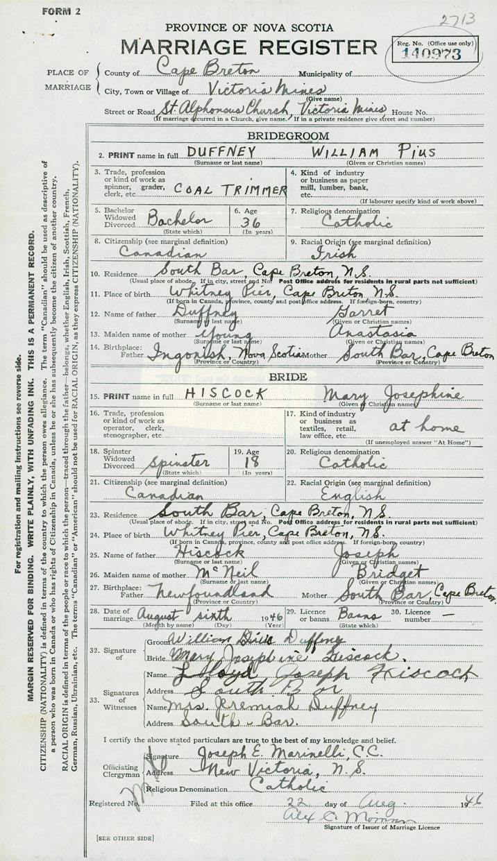 27. Birthplace Father Newfoundland Mother South Bar, Cape Breton
