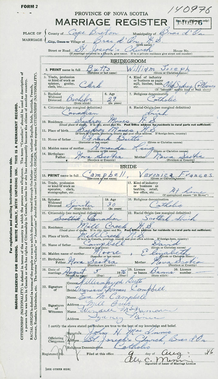 28. Date of marriage August 5 1946 29. By license or banns License 30. License number