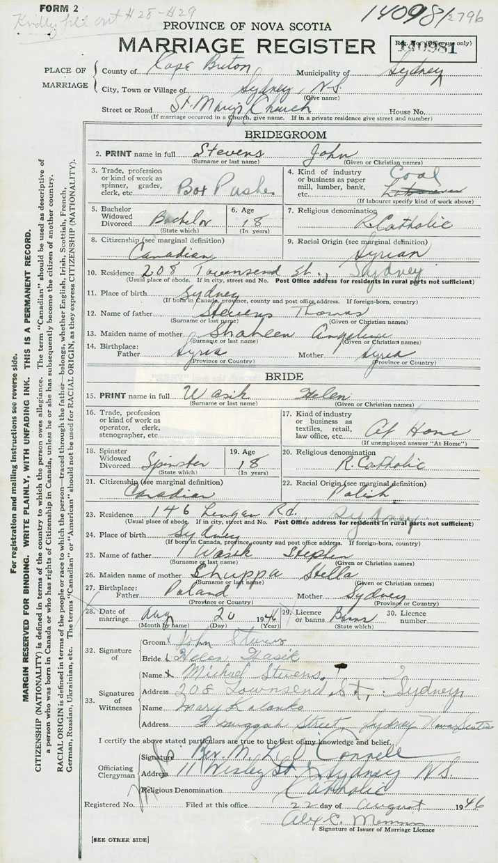 28. Date of marriage August 20 1946 29. By license or banns License 30. License number