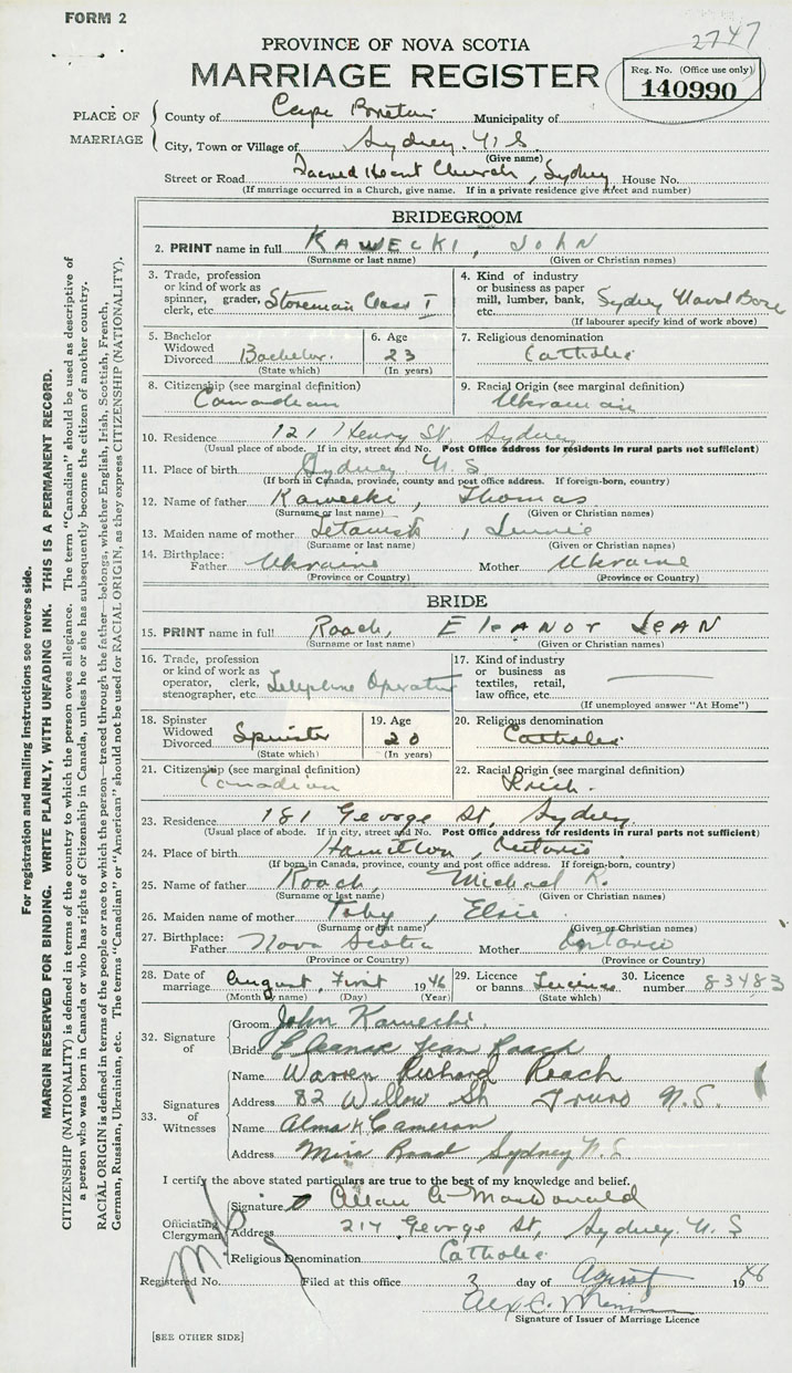28. Date of marriage August 1 1946 29. By license or banns License 30. License number 83483
