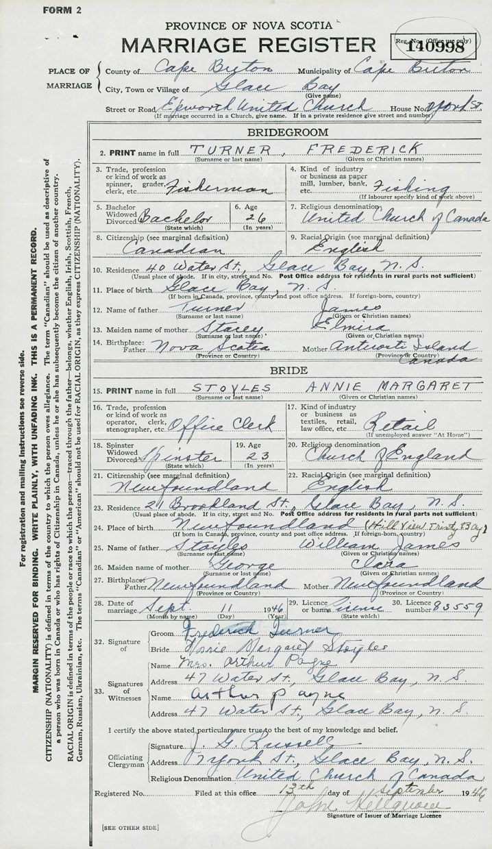 28. Date of marriage September 11 1946 29. By license or banns License 30. License number 83559