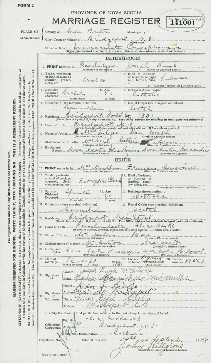 14. Birthplace Father Glace Bay Mother Benacadie