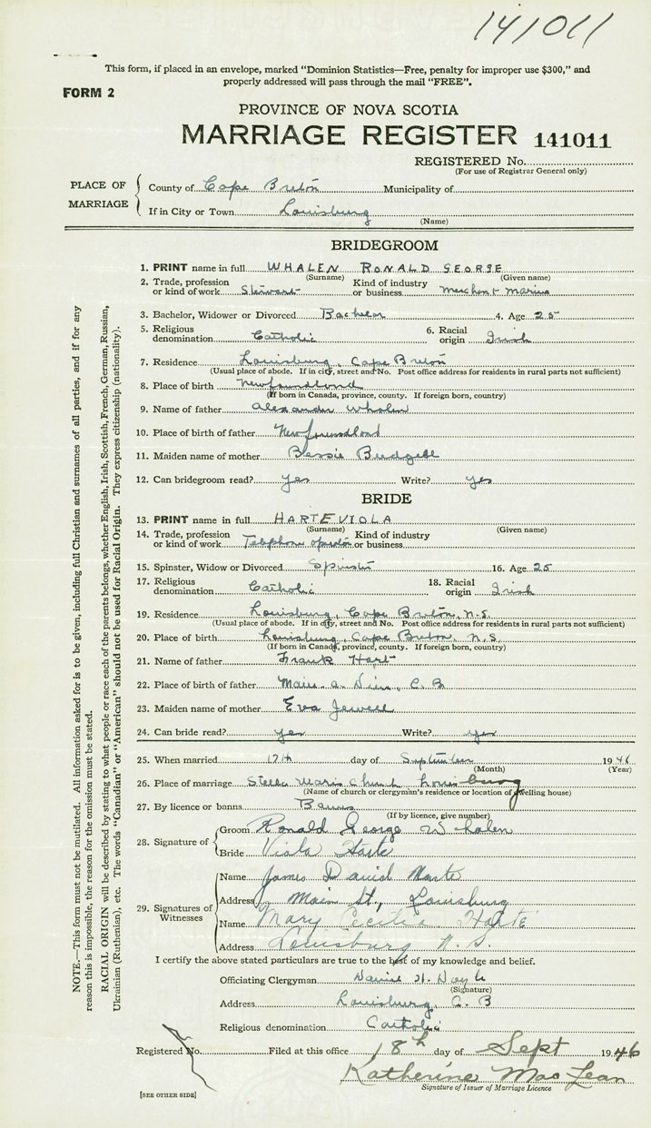 26. Place of marriage Stella Maris Church Louisburg, Cape Breton County