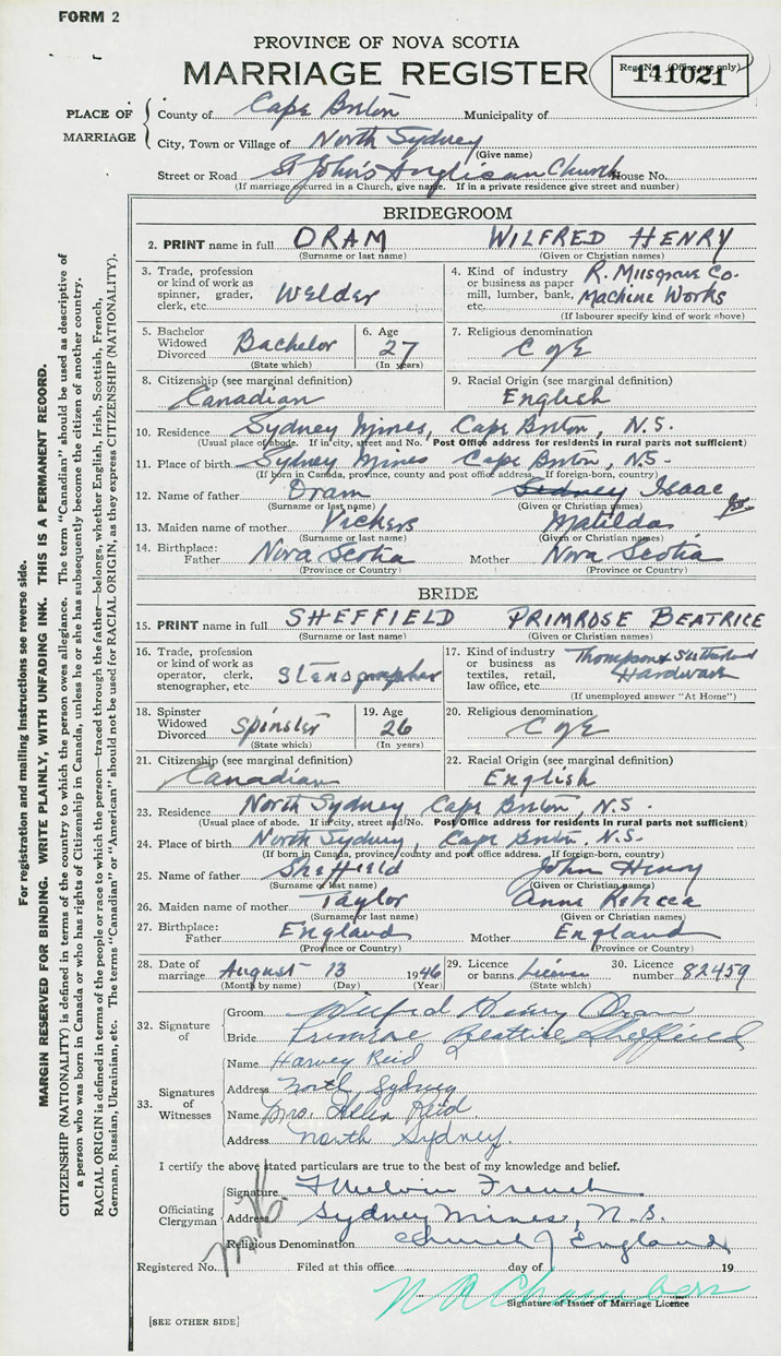 Groom Wilfred Henry Oram