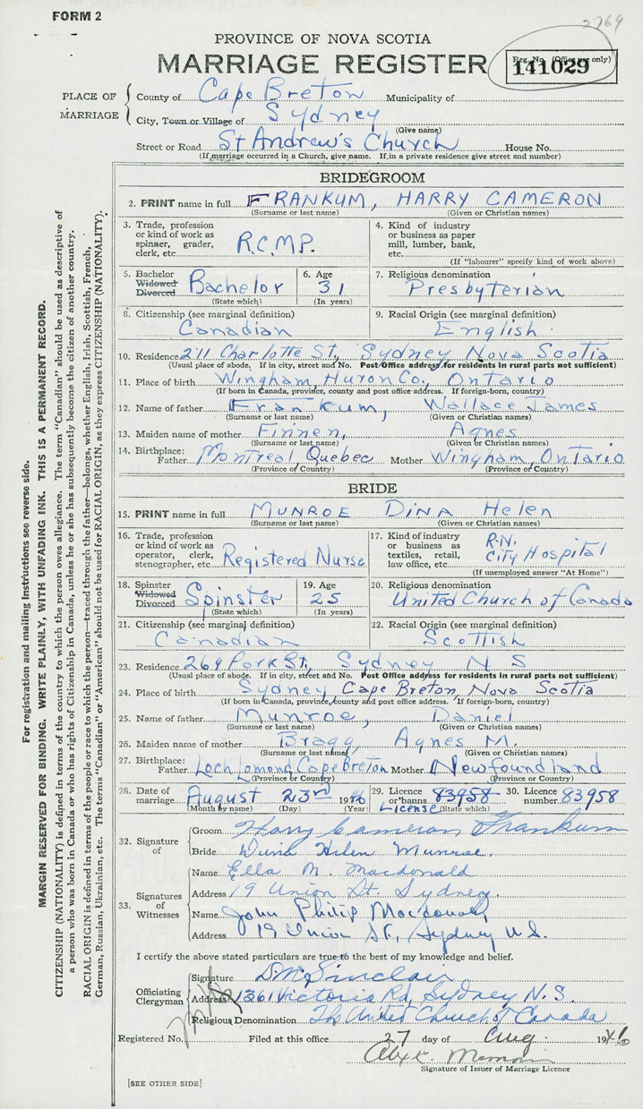 28. Date of marriage August 23 1946 29. By license or banns License 30. License number 83958