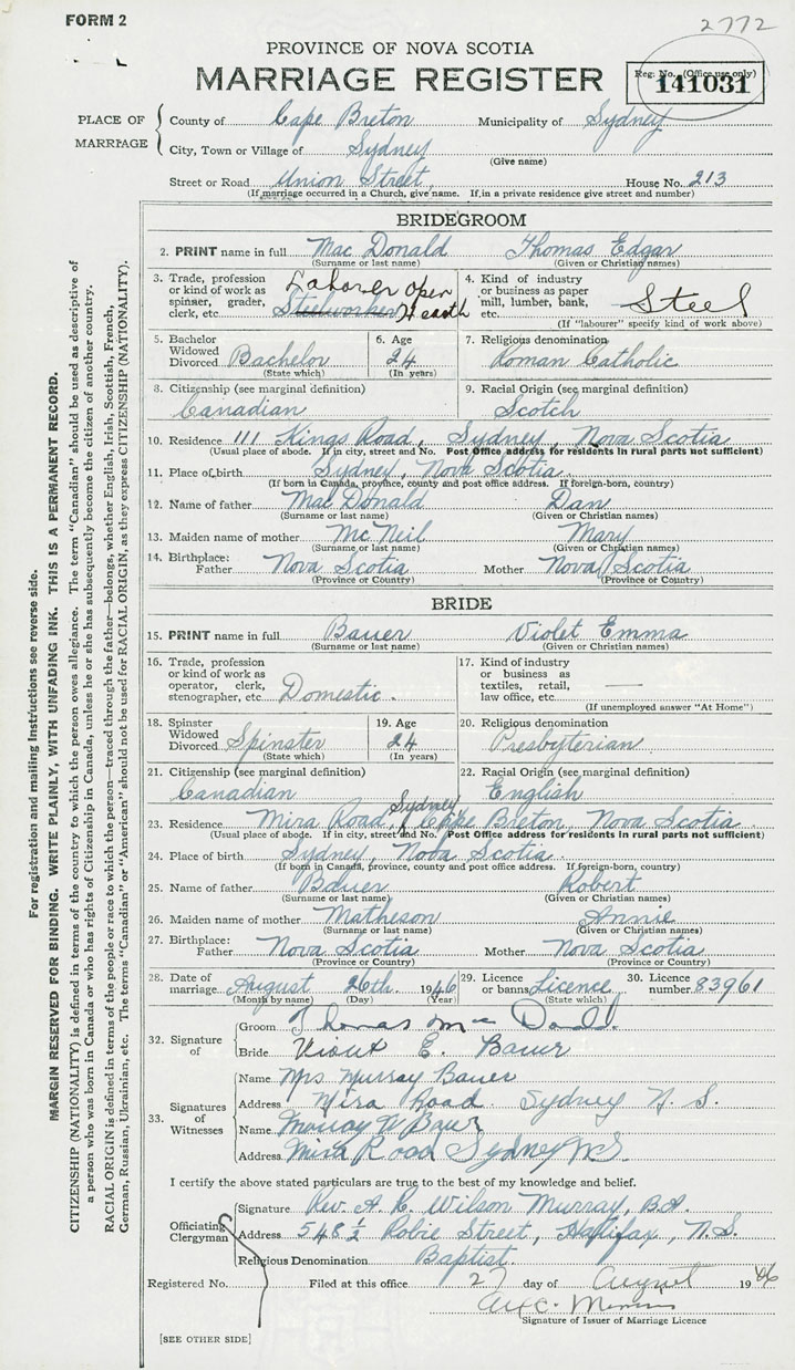 28. Date of marriage August 26 1946 29. By license or banns License 30. License number 83961