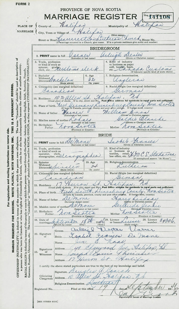 28. Date of marriage September 18 1946 29. By license or banns License 30. License number 84306
