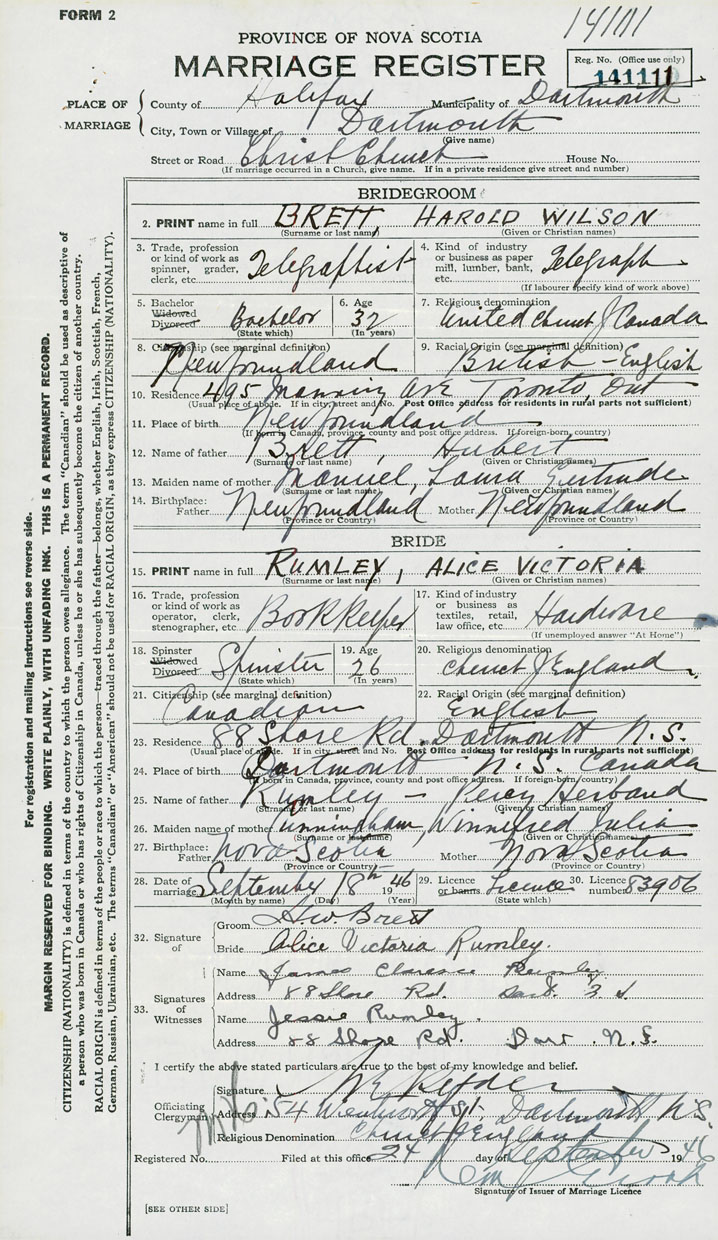 28. Date of marriage September 18 1946 29. By license or banns License 30. License number 83906