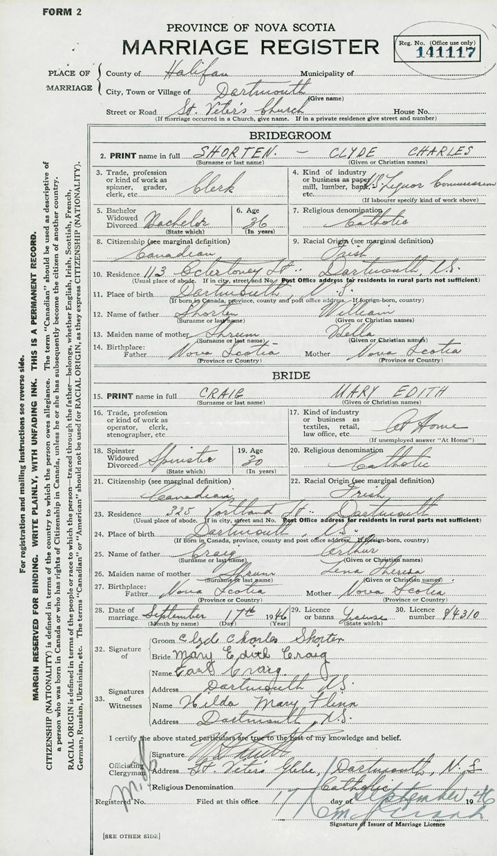 28. Date of marriage September 17 1946 29. By license or banns License 30. License number 84310