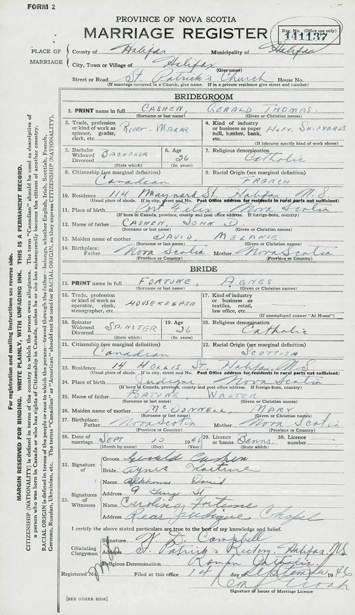 28. Date of marriage September 10 1946 29. By license or banns License 30. License number