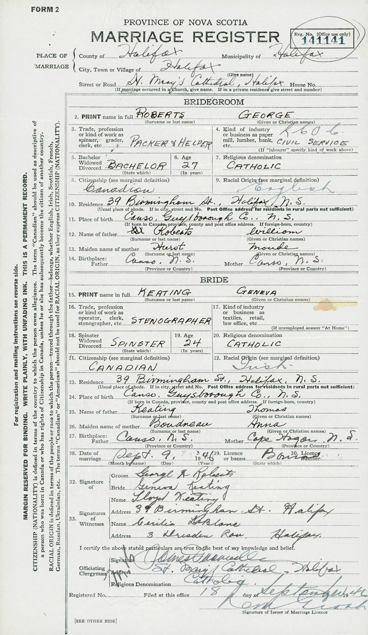 28. Date of marriage September 9 1946 29. By license or banns License 30. License number