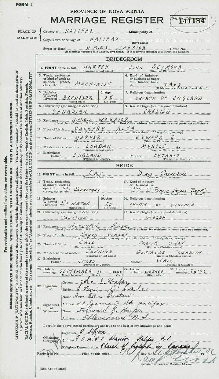 28. Date of marriage September 11 1946 29. By license or banns License 30. License number 84196