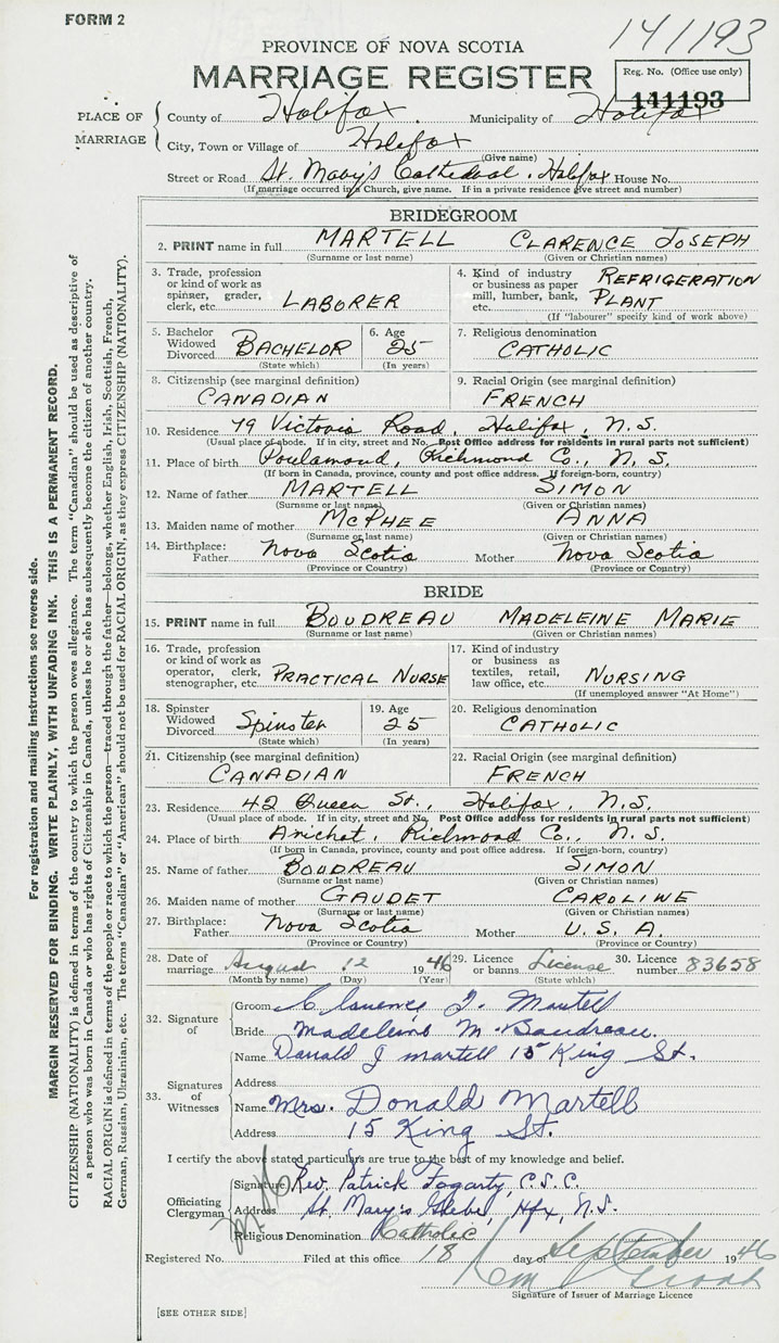 28. Date of marriage August 12 1946 29. By license or banns License 30. License number 83658