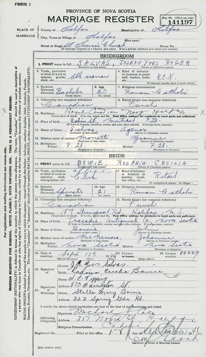 28. Date of marriage September 12 1946 29. By license or banns License 30. License number 84229