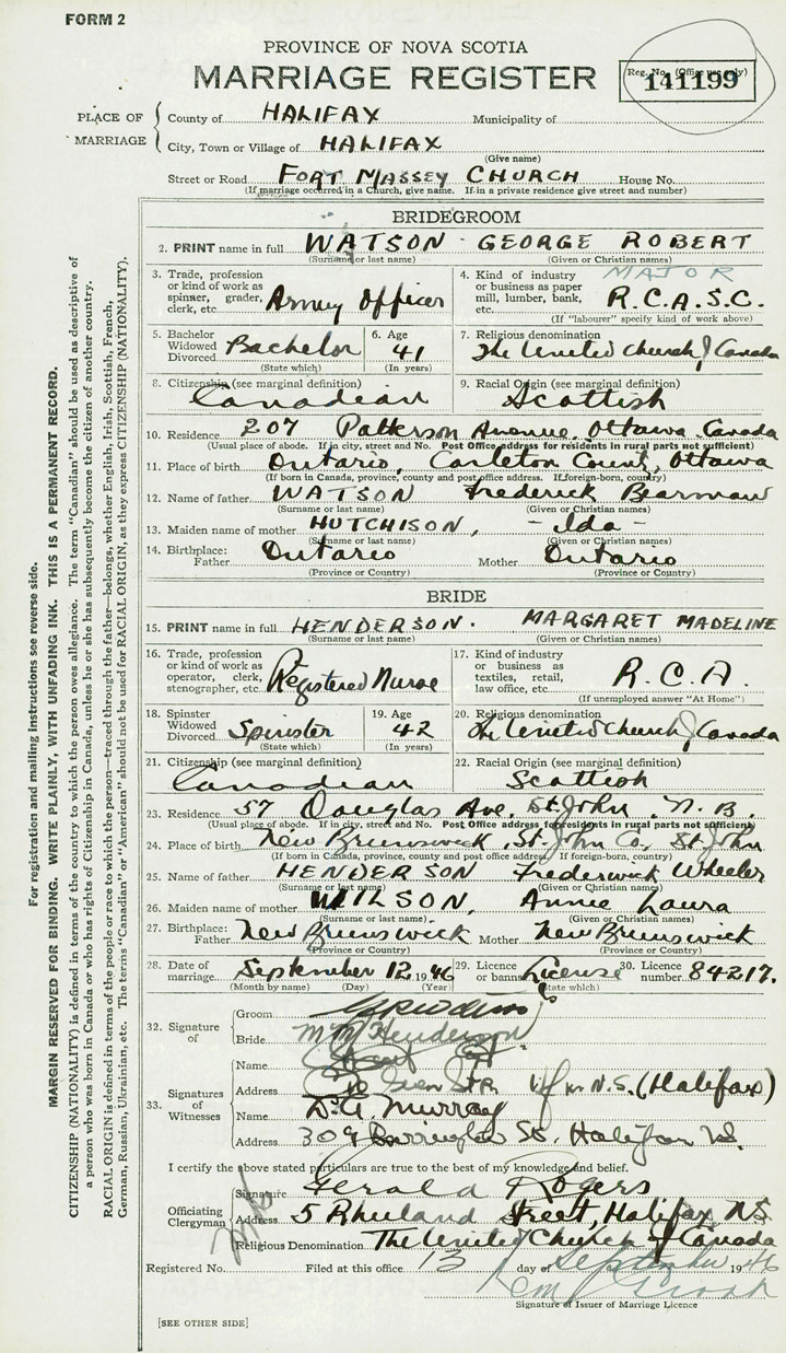 28. Date of marriage September 12 1946 29. By license or banns License 30. License number 84217