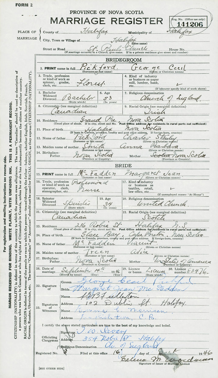 28. Date of marriage September 14 1946 29. By license or banns License 30. License number 83476