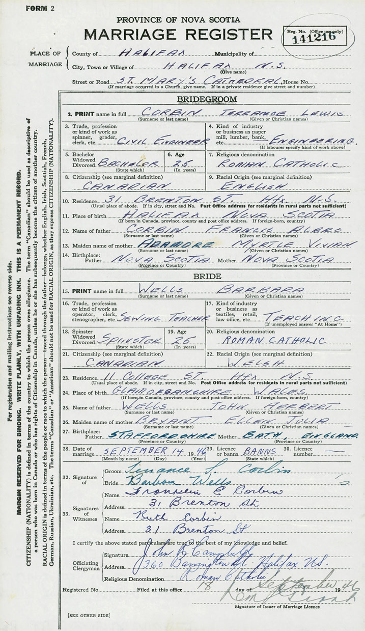 28. Date of marriage September 14 1946 29. By license or banns License 30. License number