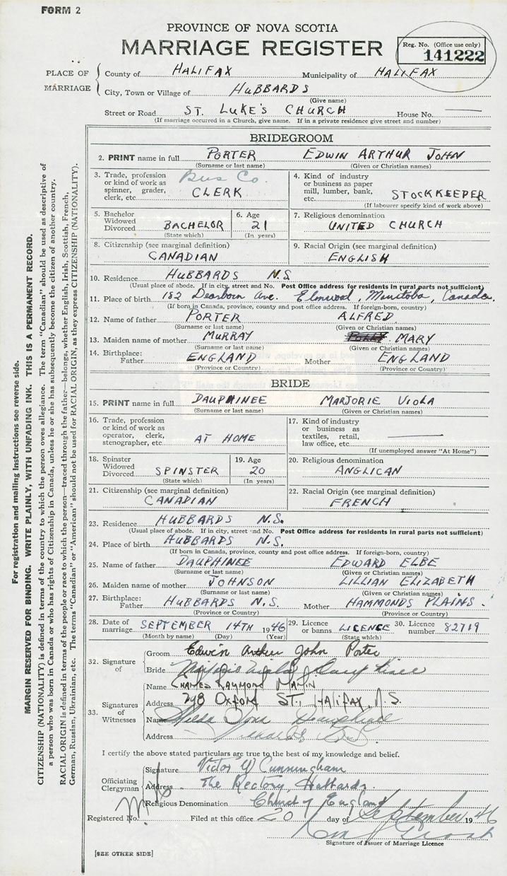 28. Date of marriage September 14 1946 29. By license or banns License 30. License number 82719